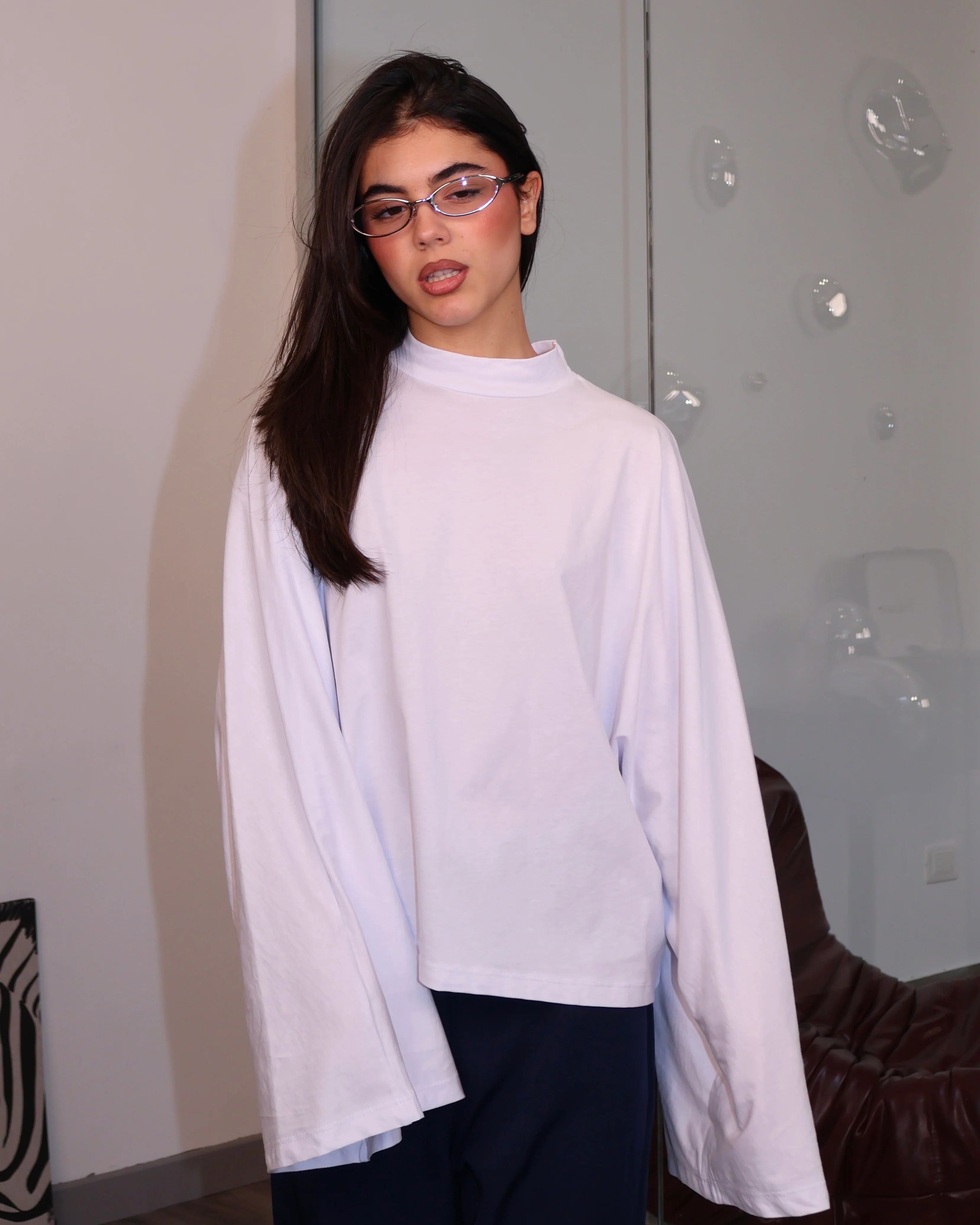 La modella è alta 1.65 ed è una S 38 italiana , taglia unica. 100% cotone